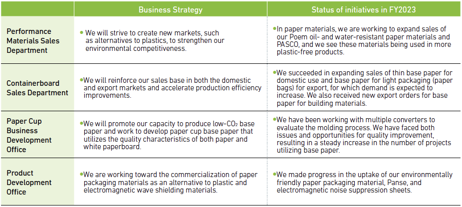 We will accelerate the development of paper cup base paper that matches user needs, leveraging our strength in low-CO2 base paper production capacity and the quality characteristics of both paper-based and white paperboard-based materials. Additionally, we will actively engage in a wide range of initiatives fostering a shift toward paper, such as plastic-free container proposals in collaboration with Hokuetsu Package Co., Ltd., and marketing activities involving paper containers.